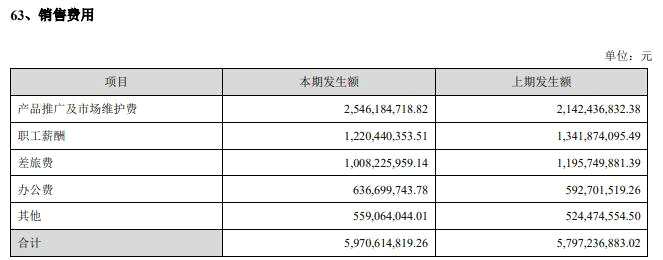 2020年的銷售費用中,產(chǎn)品推廣及市場維護費25.46億元,職工薪酬12.20億元,差旅費10.08億元,辦公費6.37億元,其他5.59億元。