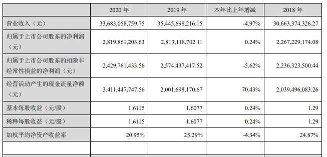 互聯(lián)網(wǎng)北京4月21日訊 昨晚,華東醫(yī)藥(000963)(000963.SZ)發(fā)布的年報顯示,2020年公司實現(xiàn)營業(yè)收入336.83億元,同比減少4.97%;歸屬于上市公司股東的凈利潤為28.20億元,同比增長0.24%;歸屬于上市公司股東的扣除非經(jīng)常性損益的凈利潤24.30億元,同比減少5.62%;經(jīng)營活動產(chǎn)生的現(xiàn)金流量凈額34.11億元,同比增長70.43%;加權平均凈資產(chǎn)收益率20.95%,同比下降4.34%。
