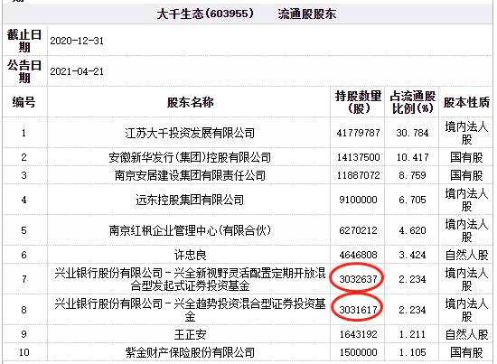 其中,興業(yè)銀行股份有限公司-興全新視野靈活配置定期開(kāi)放混合型發(fā)起式證券投資基金的持股數(shù)量為303.27萬(wàn)股,占流通股比例為2.234%,是大千生態(tài)的第七大流通股東;興業(yè)銀行股份有限公司-興全趨勢(shì)投資混合型證券投資基金的持股數(shù)量為303.16萬(wàn)股,占流通股比例為2.234%,是大千生態(tài)的第八大流通股東。