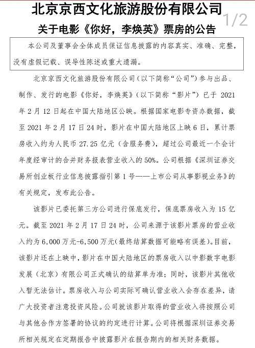 如果是階梯式,那超過(guò)15億元的部分包括北京文化在內(nèi)的出品方還能再分到一些。截止2月17日,《你好,李煥英》總票房是27.25億元。若是階梯式分賬,北京文化保底+階梯分賬的營(yíng)收僅約6000-6500萬(wàn)元,那它占的投資比例就更小了。