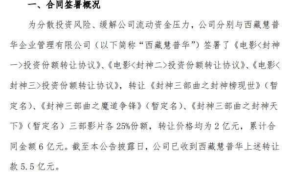 4月12日,北京文化公告,為分散投資風(fēng)險(xiǎn)、緩解流動(dòng)資金壓力,公司與西藏慧普華企業(yè)管理有限公司簽署了《電影投資份額轉(zhuǎn)讓協(xié)議》,轉(zhuǎn)讓《封神》系列三部電影各25%份額,轉(zhuǎn)讓價(jià)格均為2億元,累計(jì)合同金額6億元。截至公告披露日,已收到轉(zhuǎn)讓款5.5億元。