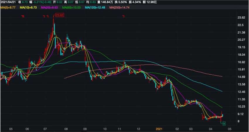 事實(shí)上,近一段時(shí)間以來,頻繁出現(xiàn)的消息面使得歐菲光市值大降。自2020年7月中旬以來,該公司的股價(jià)一路走低,截至2021年4月21日收盤,該股收于8.73元/股,相較此前每股超23元高點(diǎn)下跌超六成。同時(shí),歐菲光市值也由2020年7月中旬的600多億元跌至目前的235億元。