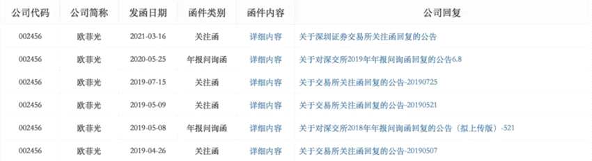 歐菲光近年收到的關(guān)注函、問詢函情況