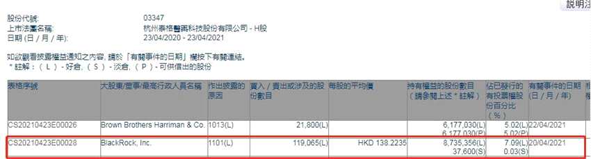 貝萊德增持泰格醫(yī)藥11.9065萬股 每股作價138.2235港元