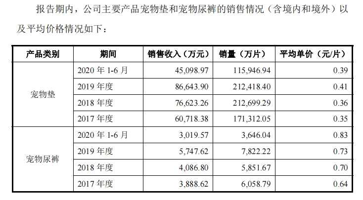 從產(chǎn)品銷量看,2019年依依股份寵物墊銷量合計21.24億片,平均單價為0.41元/片;寵物尿褲銷量為7822.22萬片,平均單價為0.73元/片。兩項產(chǎn)品同期貢獻(xiàn)的銷售收入分別達(dá)到8.66億元、5747.62萬元,分別占公司同期營業(yè)總收入的84.31%、5.59%。