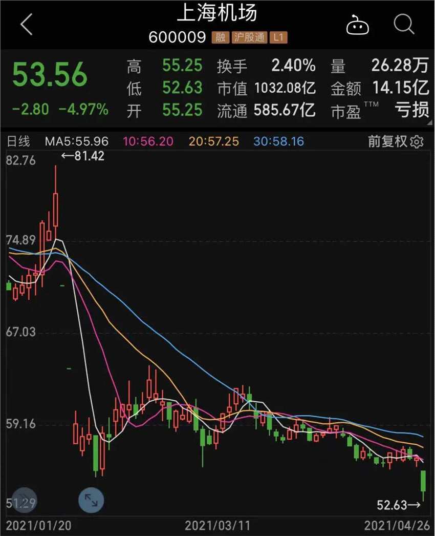 上海機(jī)場今日早盤一度跌超5%,股價(jià)創(chuàng)兩年來新低,消息面上,上海機(jī)場董事長在2020年度業(yè)績說明會(huì)上表示:免稅消費(fèi)購買力發(fā)生變化,紅利難以為繼。