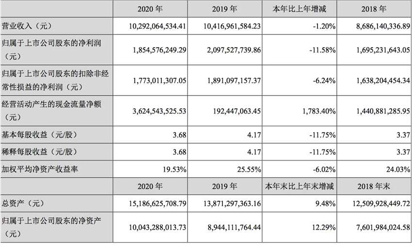 互聯(lián)網(wǎng)訊 4月29日晚間,安徽古井貢酒(000596)股份有限公司(以下簡稱:古井貢酒)發(fā)布2020年年度報(bào)告,報(bào)告期內(nèi),公司實(shí)現(xiàn)營業(yè)收入102.92億元,同比下降1.2%;歸屬于上市公司股東的凈利潤18.55億元,同比下降11.58%;基本每股收益3.68元。擬向全體股東每10股派發(fā)現(xiàn)金紅利15.00元(含稅)。