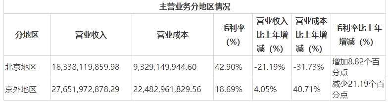 不過從毛利率來看,首開股份北京地區(qū)主營業(yè)務(wù)毛利率更高,為42.90%,且較2019年增加8.82個(gè)百分點(diǎn)。京外地區(qū)相關(guān)業(yè)務(wù)的毛利率僅為18.69%,同比減少21.19個(gè)百分點(diǎn)。