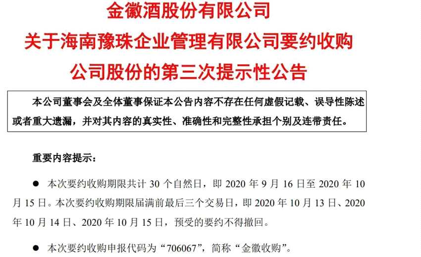 2020年9月到10月,豫園股份再出手,宣布通過(guò)海南豫珠以7.15億元要約收購(gòu)金徽酒8%股份。截至2020年10月20日,相關(guān)要約收購(gòu)清算過(guò)戶手續(xù)已經(jīng)辦理完畢,豫園股份及其一致行動(dòng)人海南豫珠合計(jì)持有金徽酒約1.93億股。