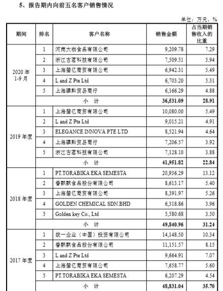 2017年-2020年前九個(gè)月,植脂末業(yè)務(wù)收入分別為12.51億元、13.65億元、14.97億元和9.64億元,分別占營業(yè)總收入的91.65%、85.94%、87.11%和85.15%。