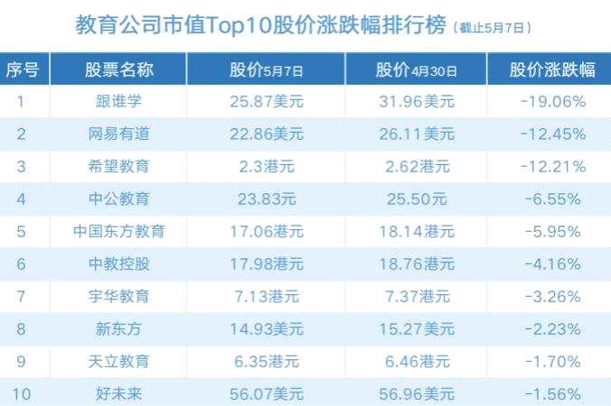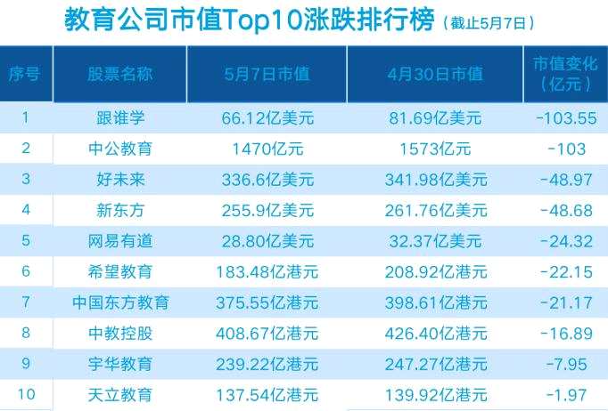對于教育公司而言,5月的第一周是黑色的。在過去一周(4月30日-5月7日),教育公司市值TOP10的10家公司股價(jià)、市值全部下滑。