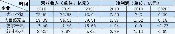 從營(yíng)業(yè)收入來(lái)說(shuō),2018年至2020年,除大自然家居有所增長(zhǎng)外,大亞圣象等余下3家企業(yè)呈現(xiàn)下降、停滯不前的趨勢(shì)。同期,上述4家企業(yè)的凈利潤(rùn)情況也不容樂(lè)觀,大亞圣象降幅為13.65%,【菲林格爾(603226)、股吧】(603226)降幅超過(guò)30%,大自然家居降幅高達(dá)88.54%,而德?tīng)栁磥?lái)更是由盈利1.04億元,“搖身一變”為虧損2700萬(wàn)元。
