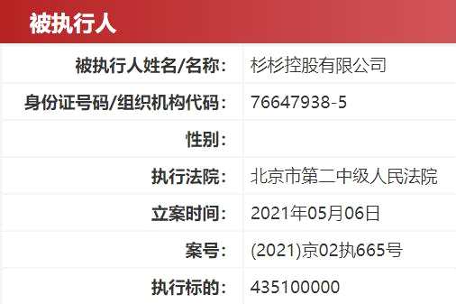 互聯(lián)網(wǎng)貝殼財(cái)經(jīng)訊(記者 朱玥怡)5月10日,記者自執(zhí)行信息公開網(wǎng)獲悉,杉杉控股有限公司(下稱“杉杉控股”)被北京市第二中級(jí)人民法院列為被執(zhí)行人,立案時(shí)間為5月6日,案號(hào)(2021)京02執(zhí)665號(hào),執(zhí)行標(biāo)的為435100000。