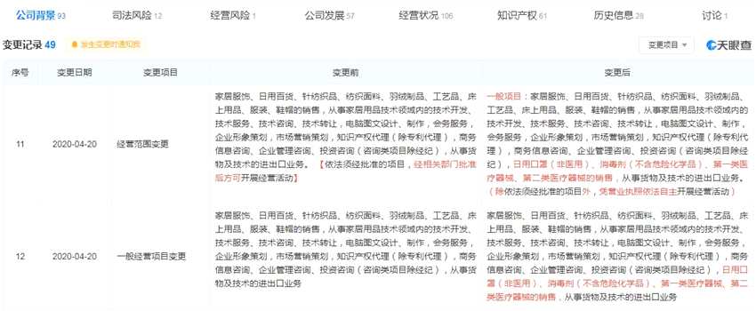 據(jù)天眼查數(shù)據(jù),2021年1月11日,三問家居變更經(jīng)營范圍,新增“貨物進(jìn)出口、技術(shù)進(jìn)出口、信息咨詢服務(wù)”等項(xiàng)目;2021年4月16日變更經(jīng)營范圍,新增“第三類醫(yī)療器械經(jīng)營、服裝服飾批發(fā)、個(gè)人衛(wèi)生用品銷售、化妝品零售批發(fā)”等項(xiàng)目。