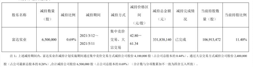 根據(jù)5月12日公告中的期限,本次富達(dá)實(shí)業(yè)減持的均價(jià)約為51元,遠(yuǎn)高于首次減持時(shí)的40元,也就是說(shuō),截至本次減持,黃文達(dá)的投資收益已經(jīng)遠(yuǎn)不止25倍。