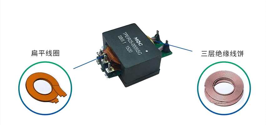 初級采用三層絕緣線繞制成線餅狀,次級采用扁平線圈,這結(jié)構(gòu)通常用在AC/DC電源中。