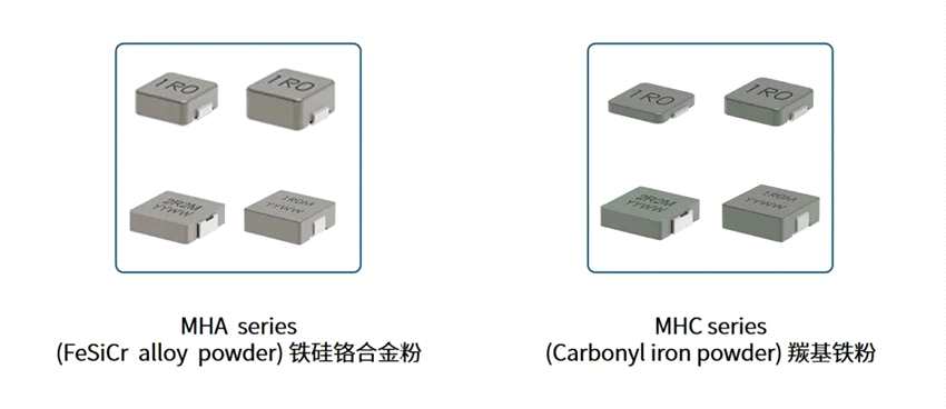 在使用的磁性材料上,可分為MHA(鐵硅鉻合金粉)系列和MHC(羰基鐵粉)系列,其中,兩者都有尺寸小、能處理不飽和的瞬態(tài)電流峰值、磁屏蔽結(jié)構(gòu)、復(fù)合結(jié)構(gòu)、超低噪音的特點,不同之處在于,MHA系列的DCR低,lrms高,而MHC系列具有高電流能力。