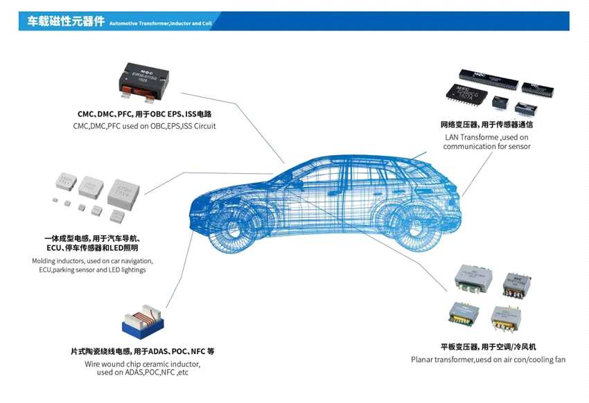 銘普光磁的一體成型電感應(yīng)用范圍廣,除了應(yīng)用于電腦、移動手機、電源、服務(wù)器等等多種領(lǐng)域,還應(yīng)用在新能源電動汽車上,作為汽車電子發(fā)展的核心元件之一,被廣泛用于汽車導(dǎo)航、BMS、ECU、停車傳感器和LED照明。目前在批量供貨給國內(nèi)某著名整車廠。