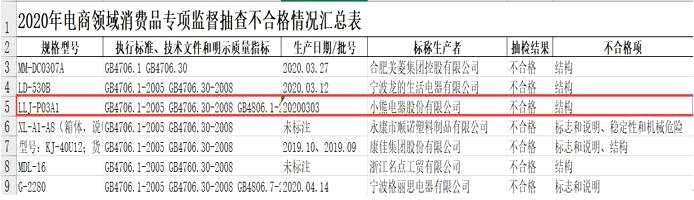 安撫奶嘴并非小熊電器拳頭產(chǎn)品,廚房小家電才是其立足之本,然而小熊電器并非首次被檢出不合格產(chǎn)品,去年年底,其就在小家電產(chǎn)品上栽了跟頭。2020年12月31日,浙江省市場監(jiān)督管理局公示的《關(guān)于2020年電商領(lǐng)域旅行箱包等18類消費品專項監(jiān)督抽查情況的通報》顯示,在涉及廚房機械方面,標(biāo)稱生產(chǎn)者為小熊電器股份有限公司、由溫州市盛通電子商務(wù)有限公司銷售的料理機(規(guī)格型號:LLJ-P03A1;生產(chǎn)日期/批號:20200303)不合格。