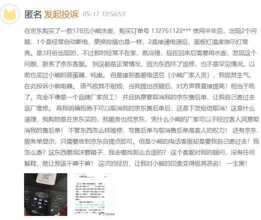 另一位消費者發(fā)布投訴稱,其購買了一款178元小熊水壺,使用半年后出現(xiàn)2個問題,1個是經(jīng)常自動斷電,更換排插也是一樣,2是接通電源后,面板燈溫度指示燈常亮。是3月份出現(xiàn)的,不過那時經(jīng)常不在家,就沒理,現(xiàn)在回來后需要用水壺,發(fā)現(xiàn)這個問題,聯(lián)系了京東客服。到這都是正常情況,因為東西壞了返修,也不是罕見情況。以前也買過小熊的蒸蛋器,燉蠱。但是接到客服電話后(小熊廠家人員),消費者極其生氣,在此投訴小熊電器。語氣極其不耐煩,當(dāng)消費者提出質(zhì)疑后,對方聲音直接提高!相當(dāng)于吼了。完全不像是一個品牌廠家員工! 并且執(zhí)意要取消該消費者的京東售后單,讓其自己寄過去返廠維修。 再消費者明確拒絕不可以取消其京東售后單后,還是下發(fā)短信取消!