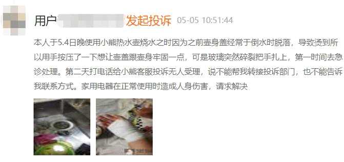 產(chǎn)品被監(jiān)管部門抽查出不合格,反映到消費者端就是多次遭到投訴。黑貓投訴平臺上有消費者投訴稱,其5月4日晚本使用小熊熱水壺?zé)畷r因為之前壺身蓋經(jīng)常于倒水時脫落,導(dǎo)致燙到所以用手按壓了一下想讓壺蓋跟壺身牢固一點,可是玻璃突然碎裂把手扎上,第一時間去急診處理。第二天打電話給小熊客服投訴無人受理,說不能幫忙轉(zhuǎn)接投訴部門,也不能告訴該消費者聯(lián)系方式。家用電器在正常使用時造成人身傷害,請求解決。