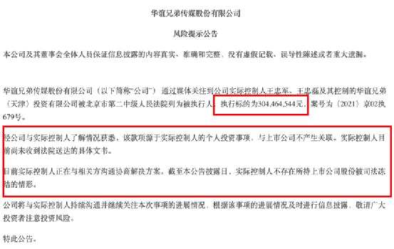 5月10日晚間,華誼兄弟也同時發(fā)布公告稱,經(jīng)公司與實際控制人了解情況獲悉,該款項源于實際控制人的個人投資事項,與上市公司不產(chǎn)生關(guān)聯(lián)。實際控制人目前尚未收到法院送達(dá)的具體文書。目前實際控制人正在與相關(guān)方溝通協(xié)商解決方案。截至本公告披露日,實際控制人不存在所持上市公司股份被司法凍結(jié)的情形。