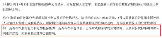 另外,根據(jù)昨晚公告,深交所要求華誼兄弟說明,實際控制人被列為被執(zhí)行人,執(zhí)行標(biāo)的3億元,5月12日披露公告顯示實際控制人與債權(quán)人暫時達(dá)成和解協(xié)議。請說明實際控制人的股票質(zhì)押是否已構(gòu)成違約,是否收到質(zhì)權(quán)人的處置股票通知,是否存在履約能力和追加擔(dān)保能力,是否存在平倉風(fēng)險。