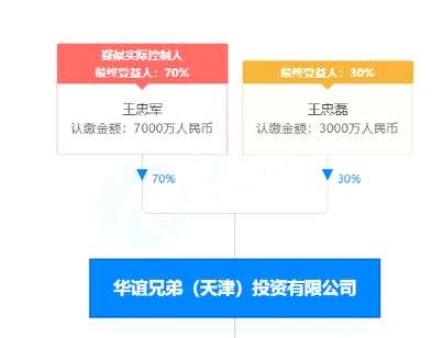 天眼查顯示,華誼兄弟(天津)投資有限公司為“華誼兄弟”王忠軍和王忠磊全額出資,其中王忠軍占有股權(quán)70%,王忠磊占有股權(quán)30%。