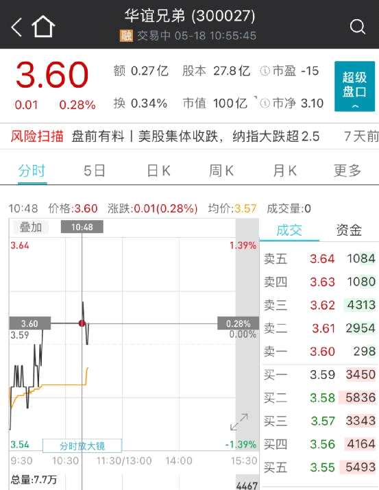 今早(5月18日),華誼兄弟開盤跌超1%,截至發(fā)稿,華誼兄弟微漲0.28%,報3.6元/股,市值再度重返100億元。