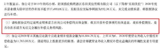 問詢函顯示,創(chuàng)業(yè)板公司管理部在對華誼兄弟2020年度報告及2021年第一季度報告事后審查中,關(guān)注到華誼兄弟于2015年向馮小剛、陸國強(qiáng)收購的浙江東陽美拉傳媒有限公司2020年度承諾業(yè)績?yōu)榻?jīng)審計的凈利潤不低于1.749億元,東陽美拉實際凈利潤為552.38萬元,未完成業(yè)績承諾,將根據(jù)協(xié)議進(jìn)行補償。要求華誼兄弟根據(jù)協(xié)議約定,說明業(yè)績承諾方應(yīng)向公司補償?shù)木唧w金額,截至目前補償事項的具體進(jìn)展,最后補償期限,是否存在承諾方無法完全履行補償義務(wù)的風(fēng)險。