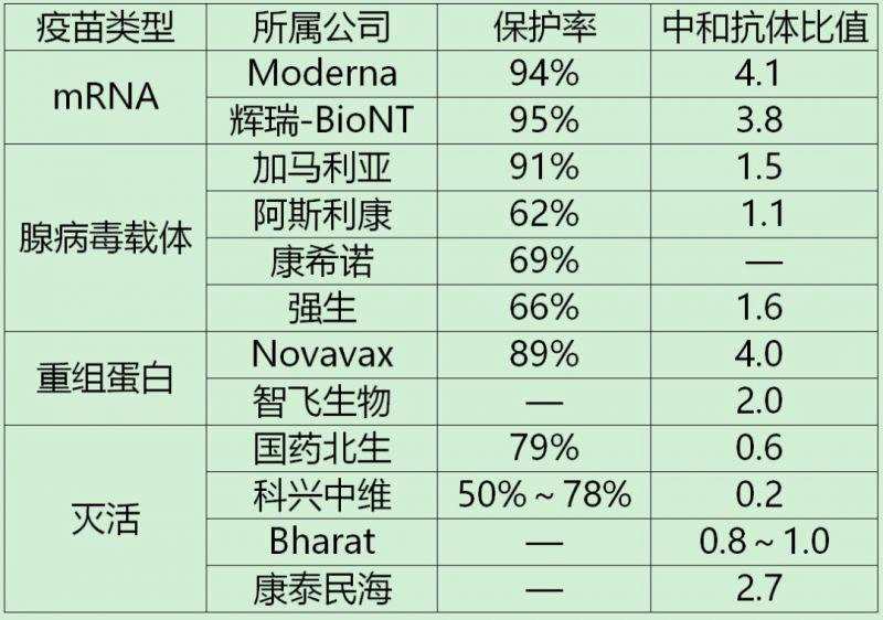 陶黎納表示,按疫苗技術(shù)路徑看,mRNA疫苗的中和抗體比值最高(3.8-4.1),保護(hù)率也最高,超過90%;重組蛋白疫苗的中和抗體比值其次(2-4),保護(hù)率略低于mRNA疫苗;腺病毒載體疫苗中和抗體比值都沒超過2;滅活疫苗除KCONVAC,其他疫苗中和抗體比值都不超過1。