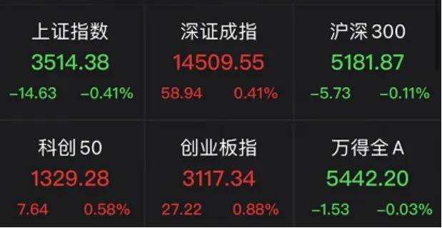 5月19日上午,A股三大股指走勢(shì)分化。截至午盤,滬指下跌0.41%,報(bào)3514.38點(diǎn);深成指上漲0.41%,報(bào)14509.55點(diǎn);創(chuàng)業(yè)板指上漲0.88%,報(bào)3117.34點(diǎn)。
