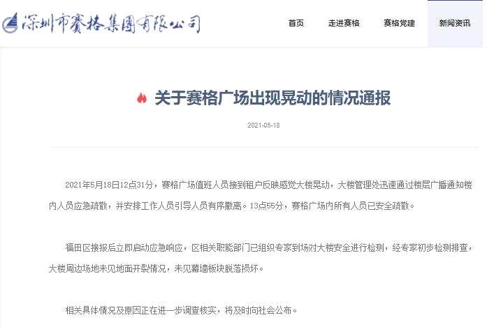 5月19日,深賽格官網(wǎng)發(fā)布消息稱,經(jīng)專家初步檢測(cè)排查,大樓周邊場(chǎng)地未見(jiàn)地面開(kāi)裂情況,未見(jiàn)幕墻板塊脫落損壞,其他相關(guān)具體情況及原因正在進(jìn)一步調(diào)查核實(shí)。深賽格表示,公司將持續(xù)關(guān)注事件的具體進(jìn)展,請(qǐng)不要相信謠言,一切以官方通報(bào)為準(zhǔn)。