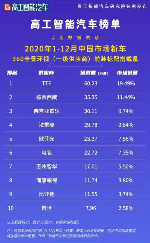 近日,高工智能汽車研究院獨(dú)家發(fā)布高工智能汽車榜單,數(shù)據(jù)顯示2020年全年中國(guó)市場(chǎng)新車360全景環(huán)視(一級(jí)供應(yīng)商)前裝標(biāo)配搭載量,TTE、德賽西威(002920)、歌樂(佛吉亞)、法雷奧、歐菲光(002456)(歐菲智聯(lián))排名2020年前裝標(biāo)配搭載上險(xiǎn)量前五。其中歐菲智聯(lián)為首次進(jìn)入前五榜單。
