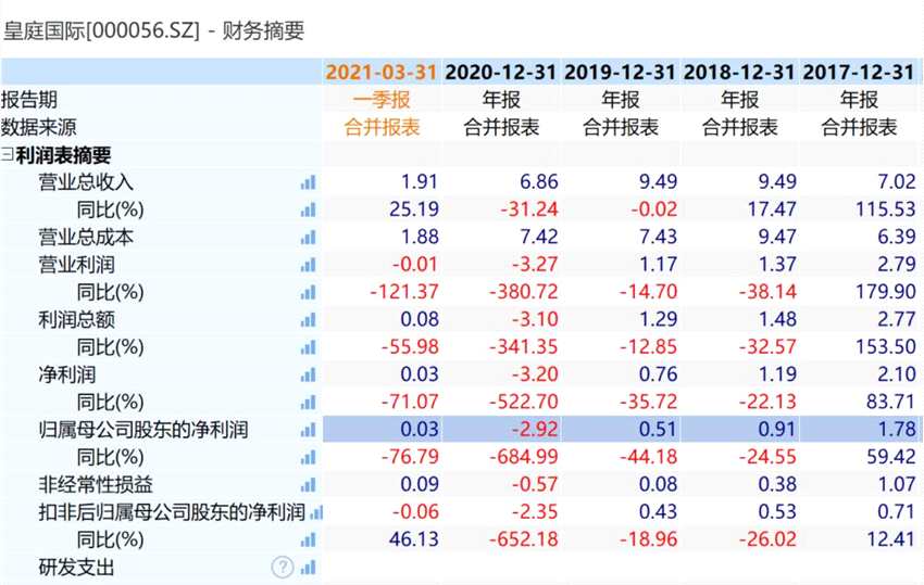 皇庭國(guó)際2020年年度報(bào)告顯示,報(bào)告期內(nèi),實(shí)現(xiàn)營(yíng)收6.86億元,同比上一年下滑31.24%;歸屬于上市公司股東的凈利潤(rùn)為-2.92億元,同比上一年下滑684.99%;歸屬于上市公司股東的扣除非經(jīng)常性損益的凈利潤(rùn)-2.35億元,同比上一年下滑652.18%。