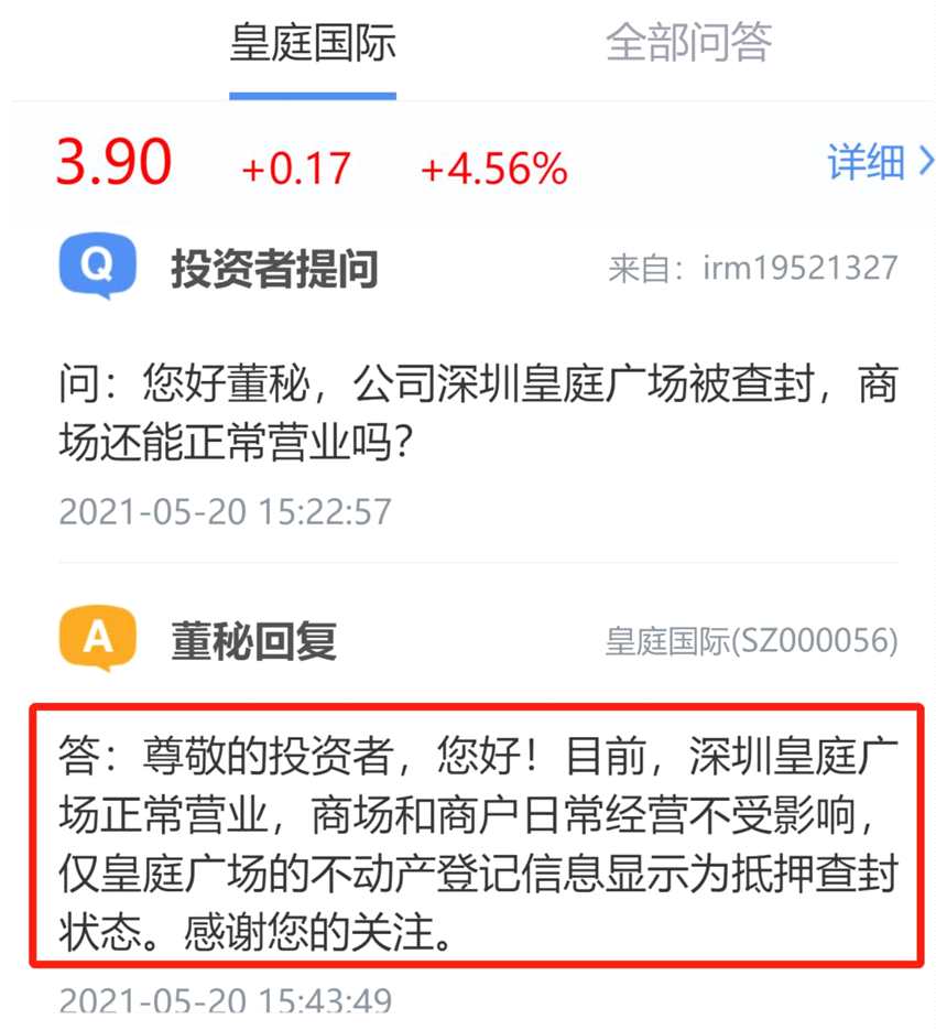 對(duì)此, 皇庭國(guó)際 (000056)5月20日在互動(dòng)平臺(tái)澄清稱(chēng),目前,深圳皇庭廣場(chǎng)正常營(yíng)業(yè),商場(chǎng)和商戶日常經(jīng)營(yíng)不受影響,僅皇庭廣場(chǎng)的不動(dòng)產(chǎn)登記信息顯示為抵押查封狀態(tài)。