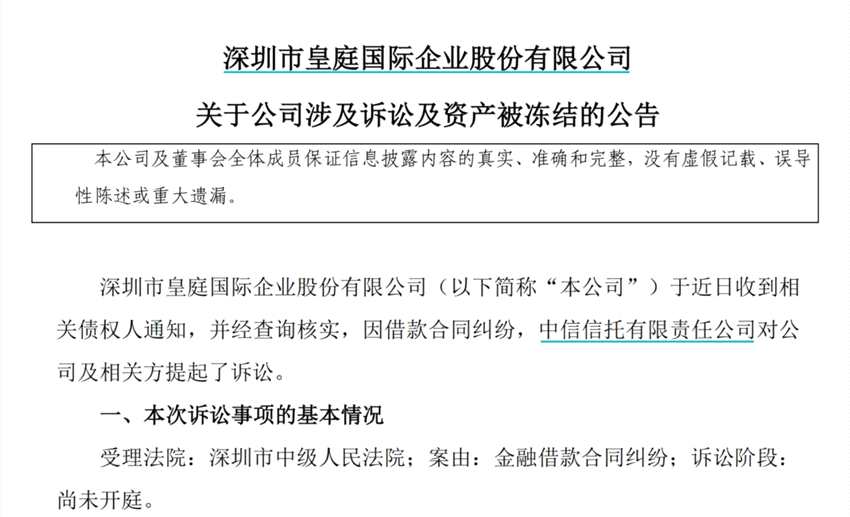 5月19日,皇庭國(guó)際(000056)(000056.SZ)發(fā)布公告稱(chēng),近日因借款合同糾紛,中信信托有限責(zé)任公司對(duì)公司及相關(guān)方提起了訴訟,申請(qǐng)查封了深圳融發(fā)投資有限公司 名下位于深圳市福田區(qū)中心區(qū)晶島國(guó)商購(gòu)物中心(即皇庭廣場(chǎng))的不動(dòng)產(chǎn),查封期限為36個(gè)月。