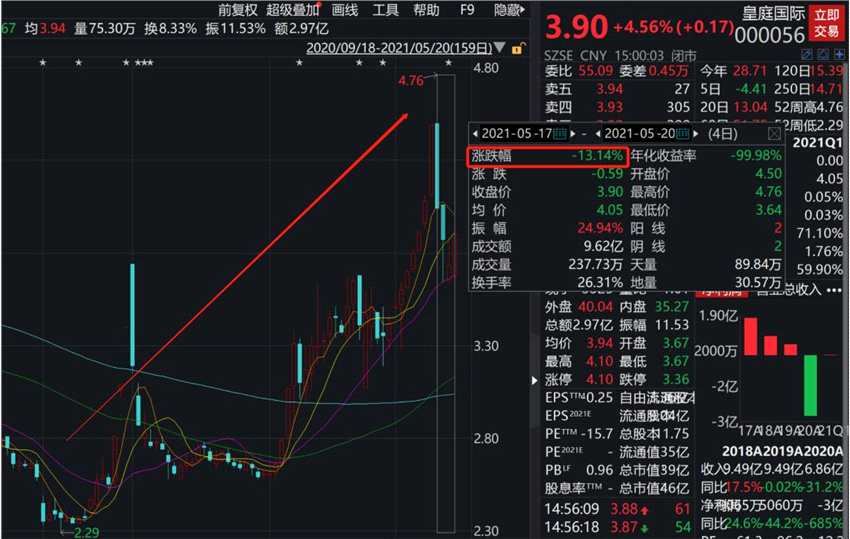 數(shù)據(jù)顯示,皇庭國(guó)際是今年的大牛股,股價(jià)自2月開(kāi)始便開(kāi)始飆漲,在上周5月17日一度暴漲至4.76元的高點(diǎn)。然而隨后跌停,并在隨后兩個(gè)交易日回落。雖然今日皇庭國(guó)際收漲4.56%,但本周仍累計(jì)暴跌超13%。