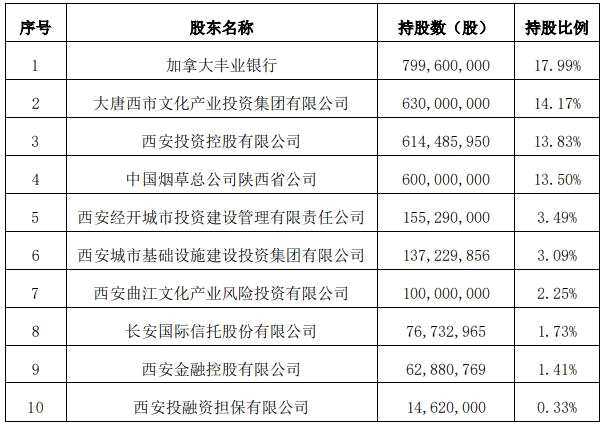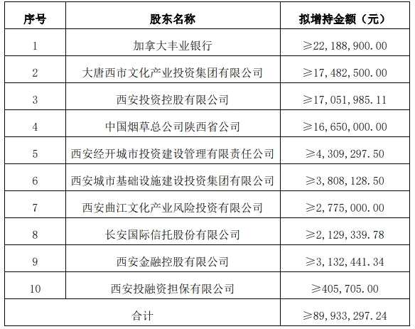 西安銀行股東加拿大豐業(yè)銀行、大唐西市文化產(chǎn)業(yè)投資集團(tuán)有限公司、西安投資控股有限公司、中國(guó)煙草總公司陜西省公司、西安經(jīng)開城市投資建設(shè)管理有限責(zé)任公司、西安城市基礎(chǔ)設(shè)施建設(shè)投資集團(tuán)有限公司、西安曲江文化產(chǎn)業(yè)風(fēng)險(xiǎn)投資有限公司、長(zhǎng)安國(guó)際信托股份有限公司、西安金融控股有限公司和西安投融資擔(dān)保有限公司擬合計(jì)增持的金額不低于8993.33萬元。