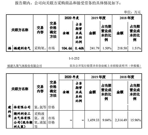 久策氣體招股書顯示,福建利安為公司2018―2019年的第一大供應(yīng)商,公司向其采購的主要產(chǎn)品為工業(yè)氧和工業(yè)氮,兩種氣體合計(jì)向其采購金額分別占當(dāng)期公司采購的90.98%和94.45%,2018年、2019年久策氣體分別向福建利安采購2532.99萬元、1701.12萬元,占當(dāng)期采購總額的比例分別為25.13%、17.40%(見圖一)。招股書還顯示,該采購數(shù)字包括向福建利安有限公司及其子公司潮州利安工業(yè)氣體有限公司(下稱“潮州利安”)的采購金額的合并。
