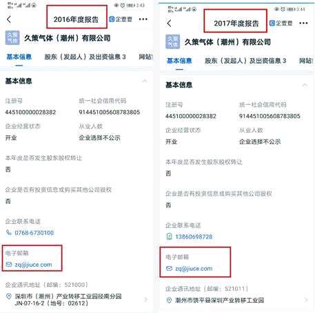 更有意思的是,收購后更名為潮州久策的“潮州利安”,多年前曾經(jīng)就叫“潮州久策”。其名稱變來變?nèi)サ谋澈螅蔷貌邭怏w一場“賣出又買進(jìn)”的交易。公開資料顯示,2010年,久策氣體與周樹輝、周樹欽共同出資設(shè)立潮州久策,久策氣體持有潮州久策80%的股權(quán)。2014年11月,久策氣體將潮州久策80%股權(quán)轉(zhuǎn)讓給福建利安。結(jié)合2019年9月久策氣體再將該企業(yè)控制權(quán)買回,意味著潮州久策在2014年11月―2019年9月間,為福建利安的控股子公司,且當(dāng)時(shí)更名為潮州利安。奇怪的是,該企業(yè)向當(dāng)?shù)厥袌霰O(jiān)督機(jī)構(gòu)提交的2016年、2017年企業(yè)年度報(bào)告顯示,這兩年中其聯(lián)系郵箱的后綴為@jiuce.com,也就是說,該企業(yè)竟然在被久策氣體賣出多年后,仍然使用與久策氣體相同后綴的企業(yè)郵箱(見圖三)。同時(shí),該企業(yè)2017年年報(bào)公布的聯(lián)系電話13860698728則與福建利安官網(wǎng)公布的聯(lián)系電話相同。