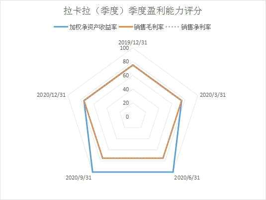 可以很直觀的看到,拉卡拉銷售毛利率和凈利率的評(píng)分始終是75分,無(wú)任何的變化,然而其加權(quán)凈資產(chǎn)收益率在2020年第二第三季度攀升后,在2020年第四季度,又出現(xiàn)下降與2019年第四季度持平,足見其自有資本獲得凈收益的能力并無(wú)提升。