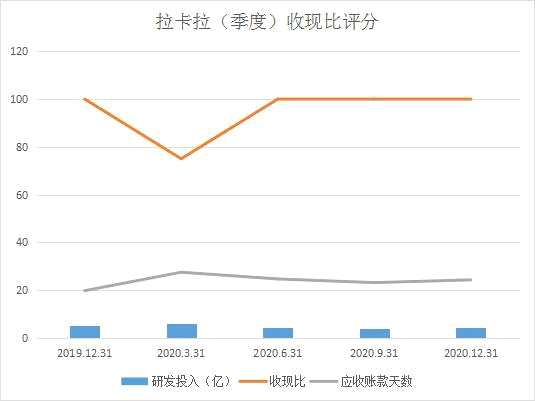 拉卡拉經(jīng)營(yíng)活動(dòng)產(chǎn)生的現(xiàn)金流相對(duì)充足,除2020年第一季度收現(xiàn)比評(píng)分降至75分,其他季度均為100分。2020年第四季度應(yīng)收賬款天數(shù)由2020年第三季度23.86升至25.85,周轉(zhuǎn)天數(shù)變長(zhǎng),研發(fā)投入和訊SGI評(píng)分一直為45分,無(wú)變化。
