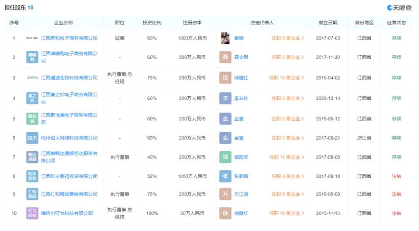 并且,江西聚和二股東黃誼東還在本次擬收購的江西聚優(yōu)美電子商務有限公司(簡稱“江西聚優(yōu)美”)、江西美之妙電子商務有限公司(簡稱“江西美之妙”)、江西合和實業(yè)有限公司擔任股東。而其大股東徐建紅也在江西聚優(yōu)美、江西美之妙擔任股東(如下圖)。