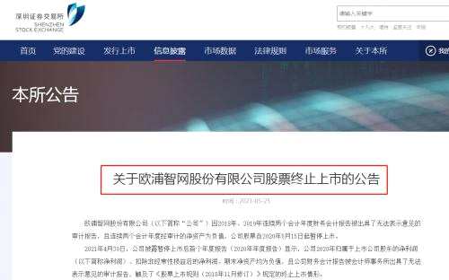2021年4月30日,歐浦智網(wǎng)披露暫停上市后首個(gè)年度報(bào)告(2020年年度報(bào)告)顯示,公司2020年歸屬于上市公司股東的凈利潤(rùn)、扣除非經(jīng)常性損益后的凈利潤(rùn)、期末凈資產(chǎn)均為負(fù)值,且公司財(cái)務(wù)會(huì)計(jì)報(bào)告被會(huì)計(jì)師事務(wù)所出具了無(wú)法表示意見(jiàn)的審計(jì)報(bào)告,觸及了《股票上市規(guī)則(2018年11月修訂)》規(guī)定的終止上市情形。