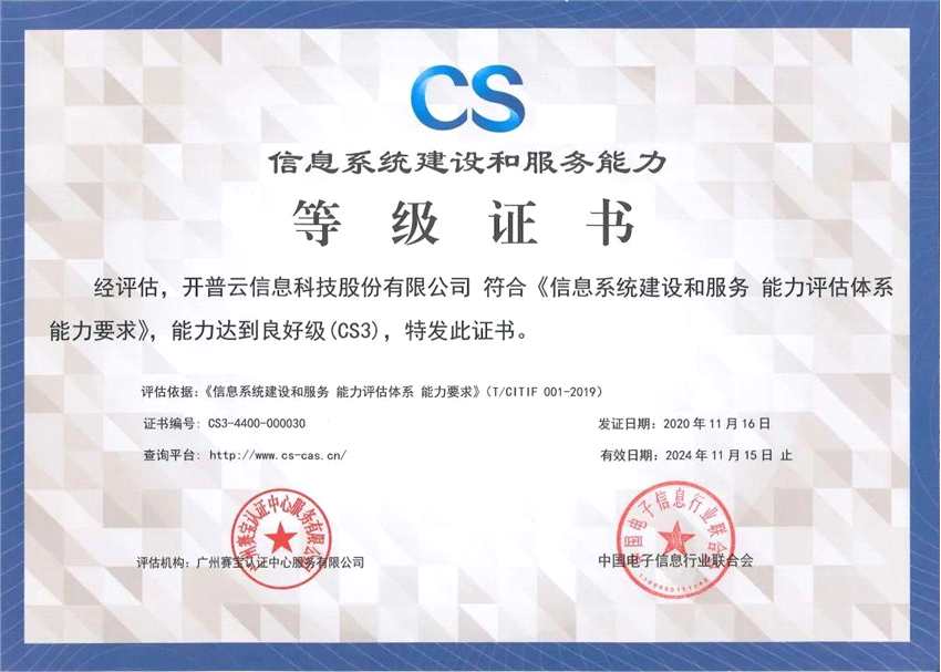 信息系統(tǒng)建設(shè)和服務(wù)能力評估(CS)是中國電子信息行業(yè)聯(lián)合會立足于行業(yè)自律、自愿申請為前提而組織開展的第三方評估活動,旨在提高信息系統(tǒng)建設(shè)和服務(wù)企業(yè)的能力與水平,促進信息系統(tǒng)建設(shè)和服務(wù)行業(yè)高質(zhì)量發(fā)展。通過CS3級認證代表開普云的戰(zhàn)略、經(jīng)營、人才、技術(shù)和管理等綜合能力達到了行業(yè)良好水平,在主要業(yè)務(wù)領(lǐng)域中有規(guī)范的業(yè)務(wù)流程,典型信息系統(tǒng)建設(shè)和服務(wù)項目具有較好技術(shù)水平。