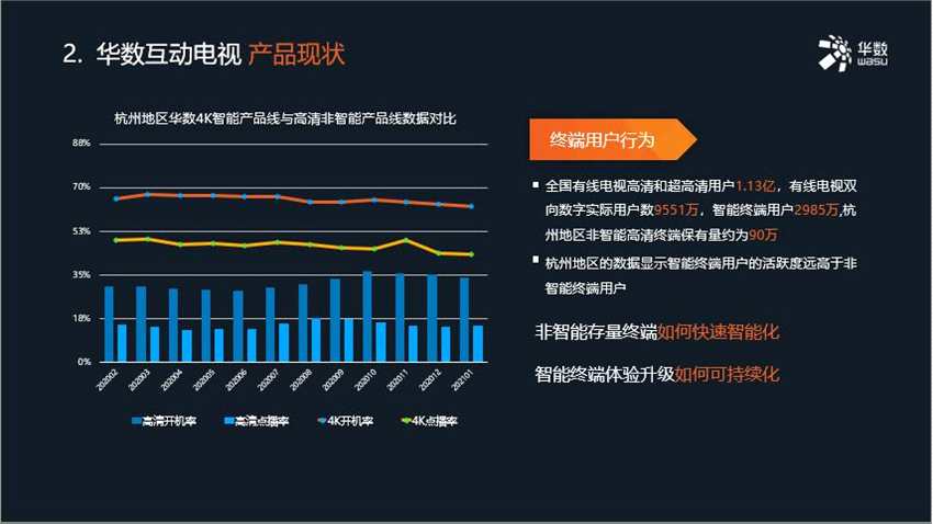 目前,全國(guó)有線電視高清和超高清用戶1.13億,有線電視雙向數(shù)字實(shí)際用戶數(shù)9551萬(wàn),智能終端用戶僅有2985萬(wàn),大大限制了廣電新業(yè)務(wù)的引入與開(kāi)展,而華數(shù)杭州地區(qū)的用戶大數(shù)據(jù)更顯示智能終端用戶的活躍度遠(yuǎn)高于非智能終端用戶。非智能存量終端如何快速智能化,智能終端體驗(yàn)升級(jí)又如何可持續(xù)化?華數(shù)帶來(lái)了全新推出的“華數(shù)喵”產(chǎn)品解決方案。