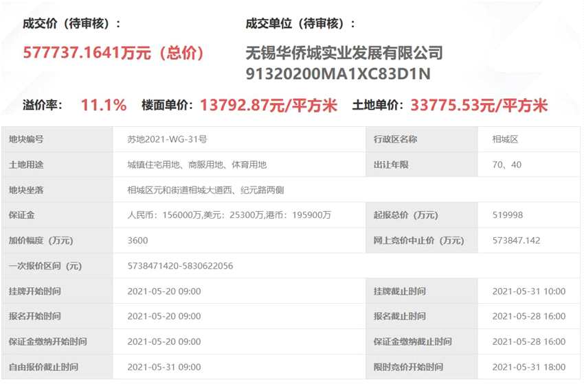 經(jīng)過31輪競(jìng)價(jià),無錫華僑城實(shí)業(yè)發(fā)展有限公司(華僑城)以57.77億元競(jìng)得2021-WG-31號(hào)地塊,樓面價(jià)13790元/㎡,溢價(jià)率11.10%。