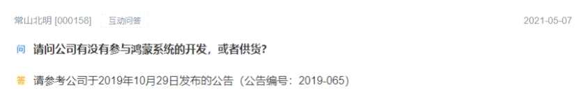 2021年5月7日,對于投資者提問與鴻蒙的合作,常山北明建議參考2019年10月29日的公告。