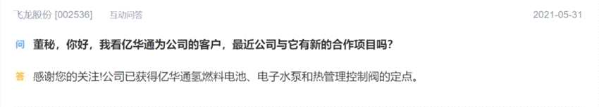 5月31日,飛龍股份在互動易上回復(fù)投資者稱,獲得【億華通(688339)、股吧】氫燃料電池等的定點。6月1日,飛龍股份回復(fù)投資者稱,與蔚來汽車建立了良好的合作關(guān)系。